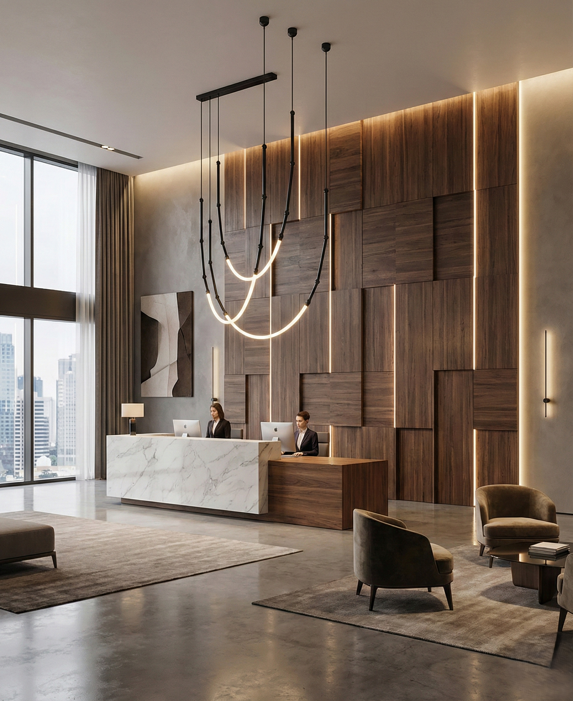 Crafted with a sleek Metal + Profile body type, this chandelier features fluid, arcing ribbons of light suspended by slender black rods. The contrast between the bold black industrial metal hardware and the seamless, glowing LED profiles creates a stunning visual centerpiece, even when switched off. Its minimalist yet dramatic silhouette draws the eye upward, making it an ideal focal point above dining tables, kitchen islands, or in grand living areas.
