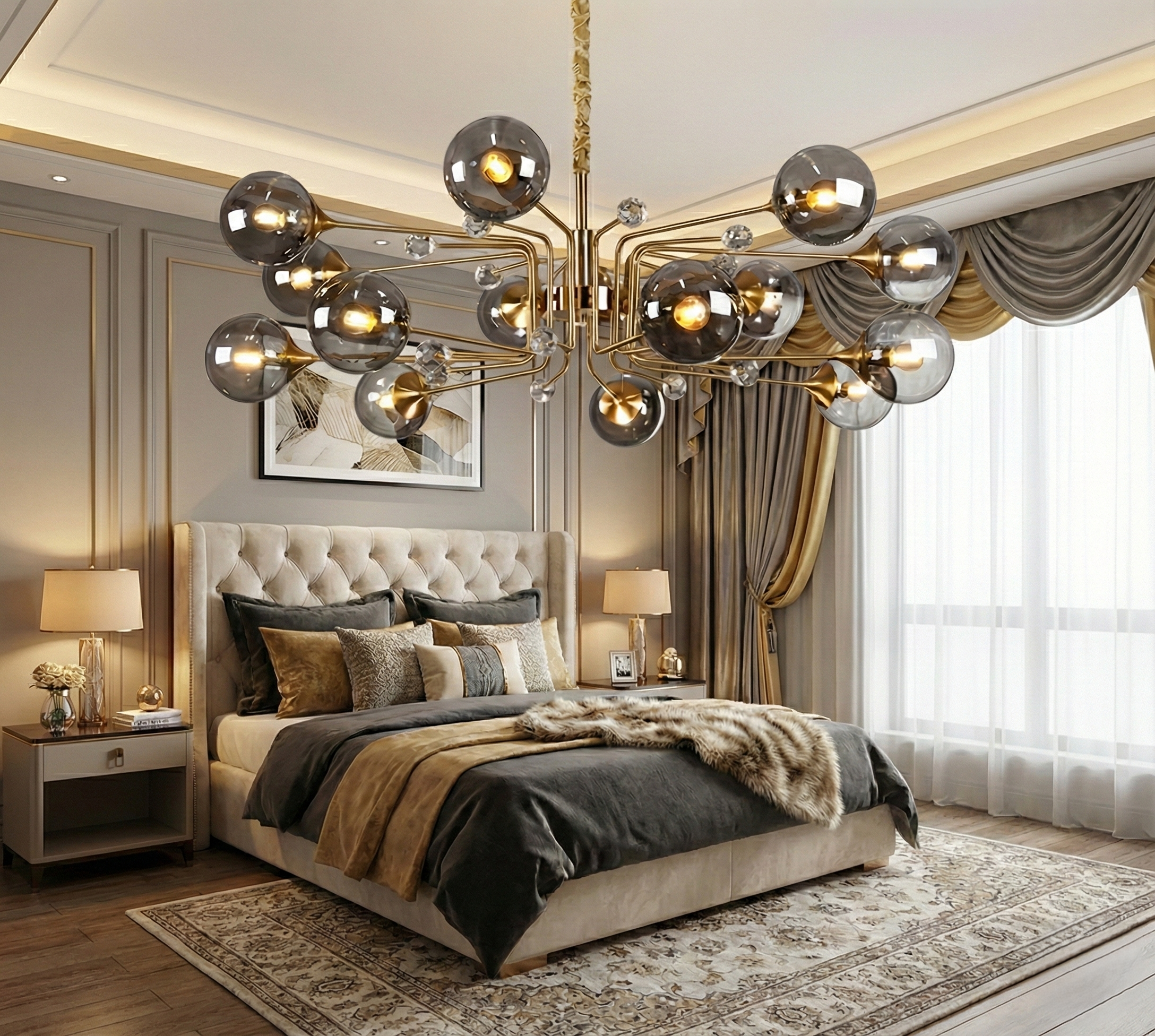 Modern Grandeur: The intricate arrangement of glass elements against the metal body creates a dazzling play of light, adding depth and texture to your ceiling.