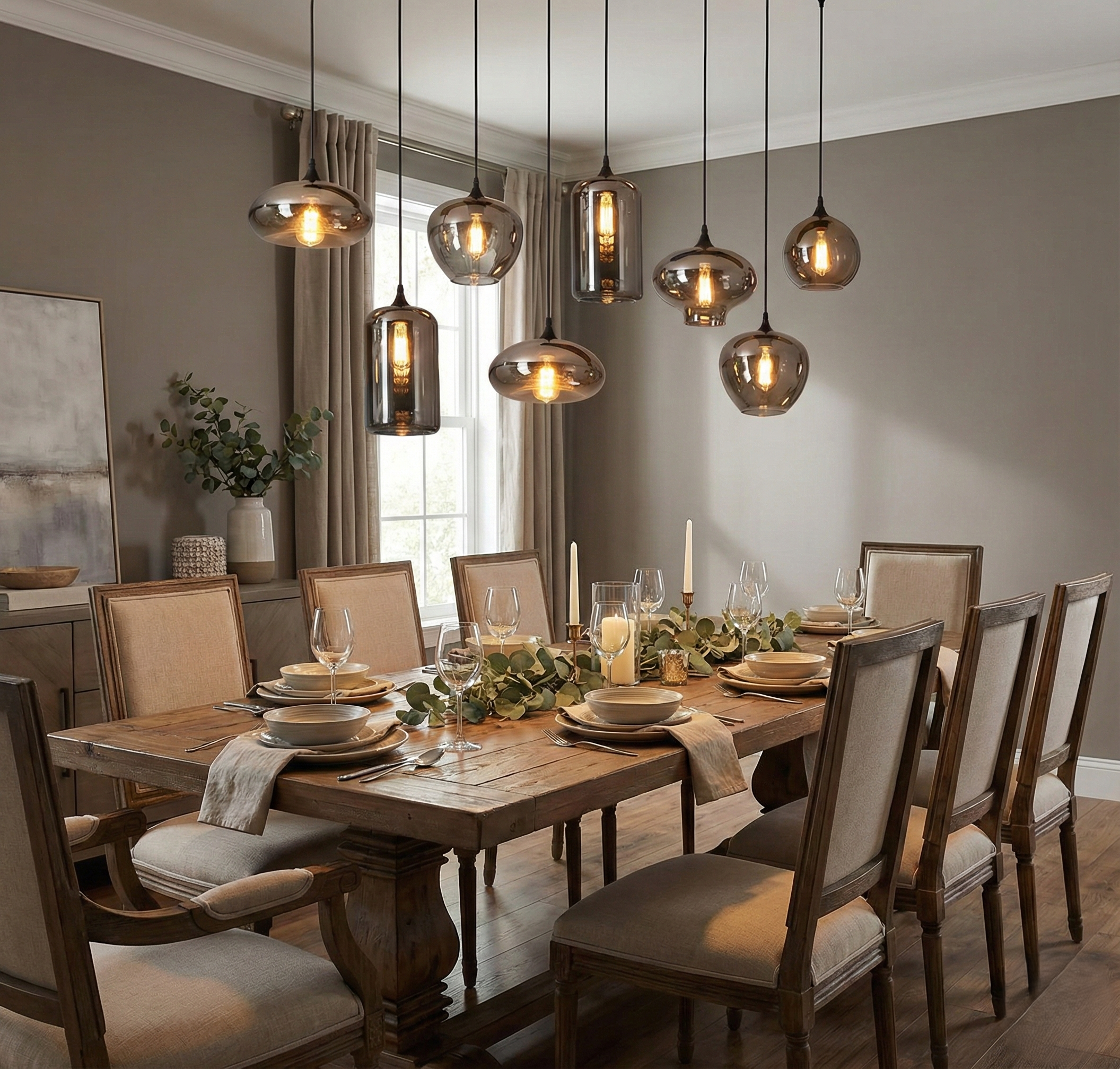 Dynamic Design: The multi-drop, staggered layout creates depth and visual interest over long dining tables and breakfast counters.