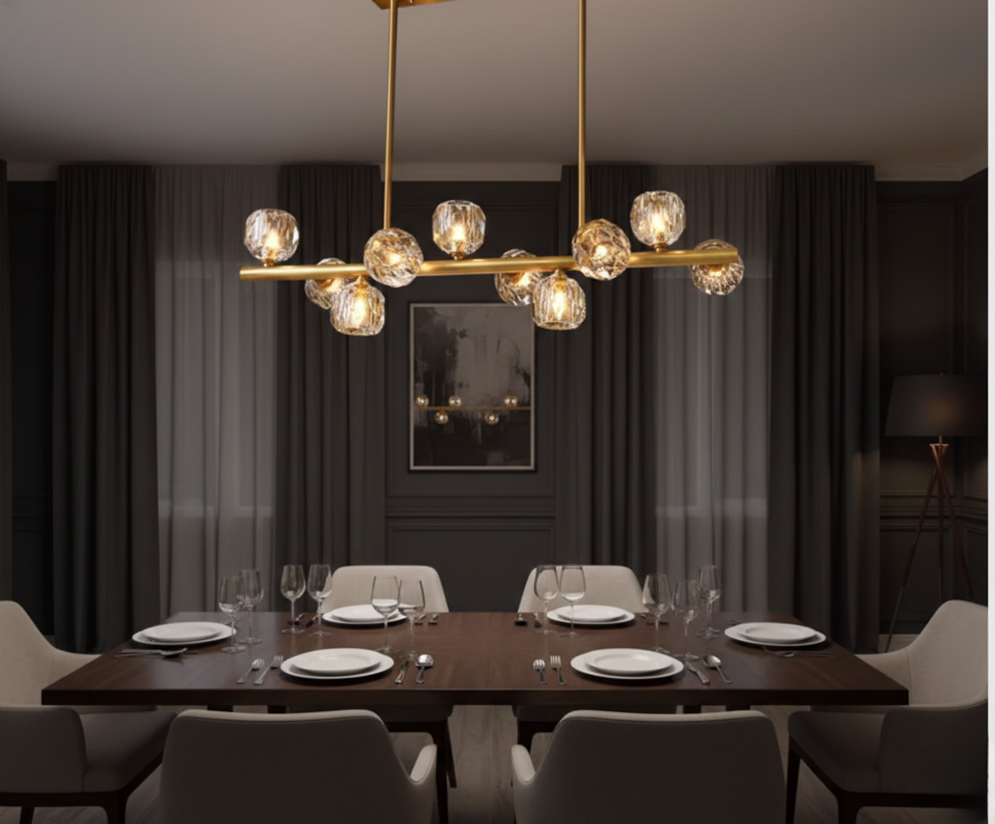The sturdy metal body ensures long-lasting performance and stability, while the finely finished glass components help diffuse light evenly, reducing glare and creating a comfortable atmosphere. Its versatile design complements a wide range of interior styles — from contemporary and minimalist to classic and luxurious — making it a perfect addition to dining rooms, kitchen areas, or stylish living spaces.