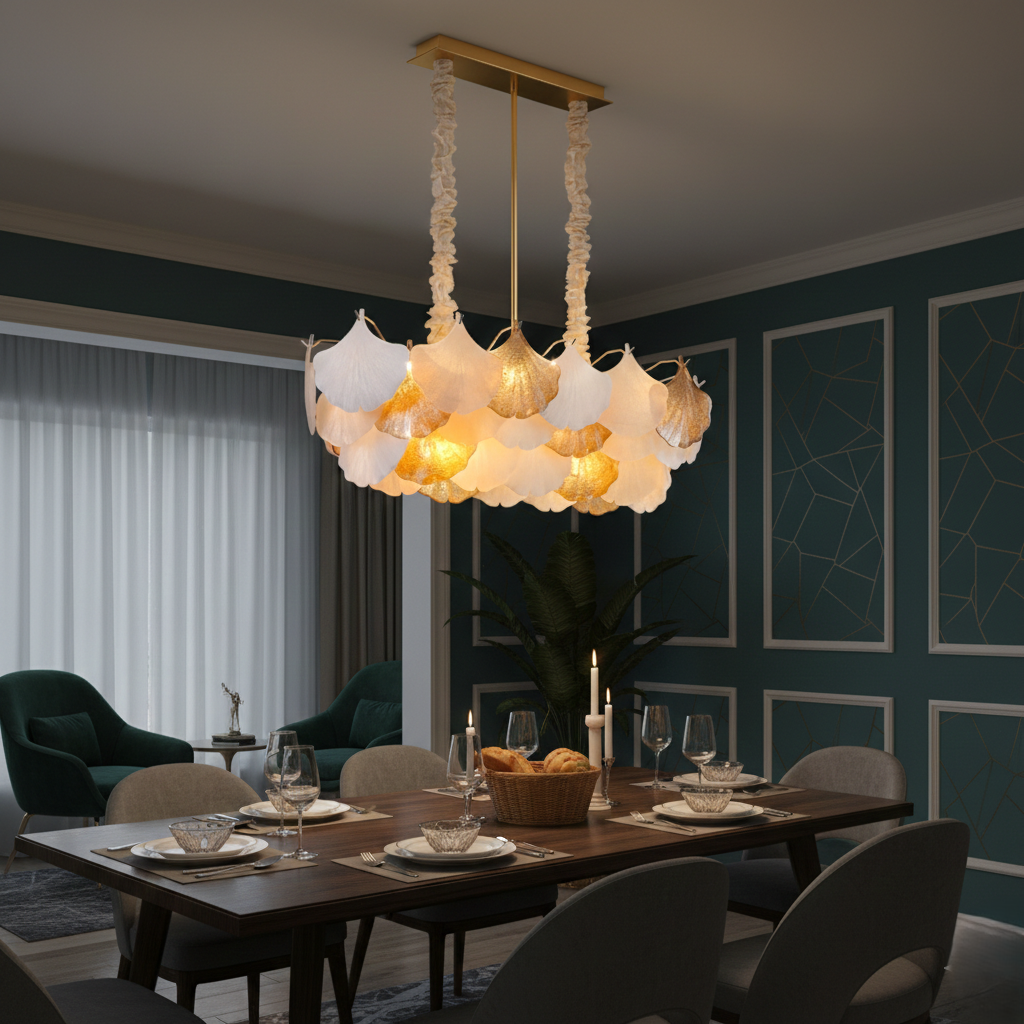 In StockEnhance your dining space with this beautifully crafted chandelier, designed to combine modern sophistication with timeless charm. Featuring a sleek metal frame paired with premium glass elements, this chandelier creates a warm and inviting ambiance—perfect for family dinners, gatherings, or special occasions.