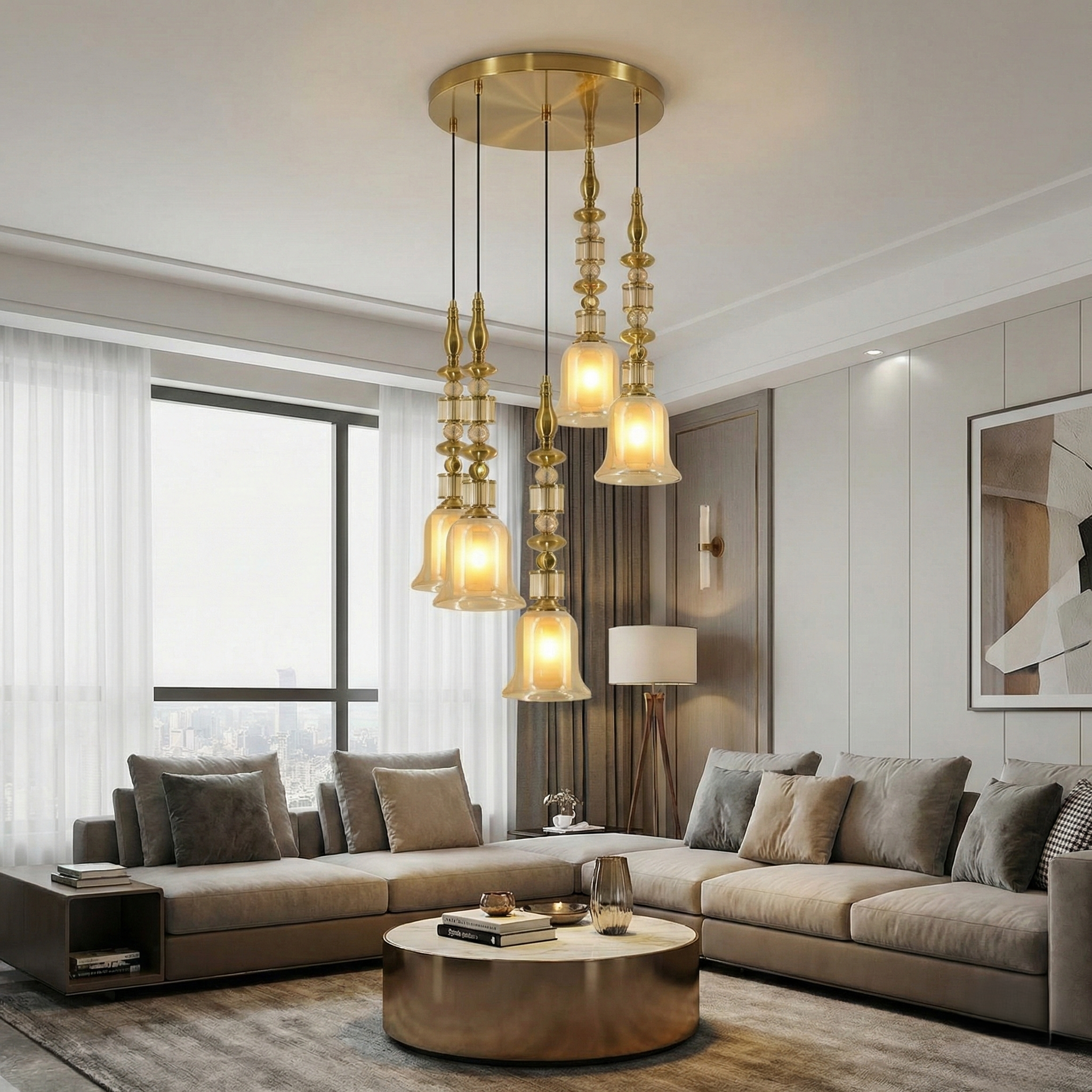 The centerpiece of this fixture is its bell-shaped glass shade, tinted in a soft amber hue that mimics the glow of a setting sun. When lit, it casts a warm, romantic light, making it the perfect addition to a sophisticated living room, a serene bedroom, or suspended in a cluster above a dining table. The "Beloved Bloom" balances intricate detailing with modern luxury, creating a focal point that is both timeless and trendy.