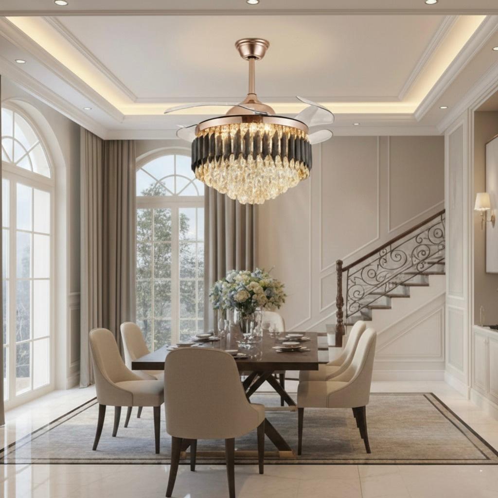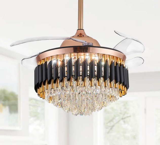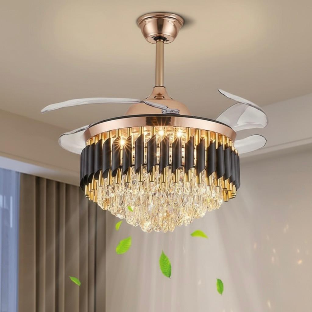In StockBlack Crown Ceiling Fan is a fusion of fierce design and high-velocity performance. Featuring a striking Black and Gold metal chassis adorned with shimmering crystals, it serves as a high-end chandelier that reveals its powerful cooling blades only when you need them.