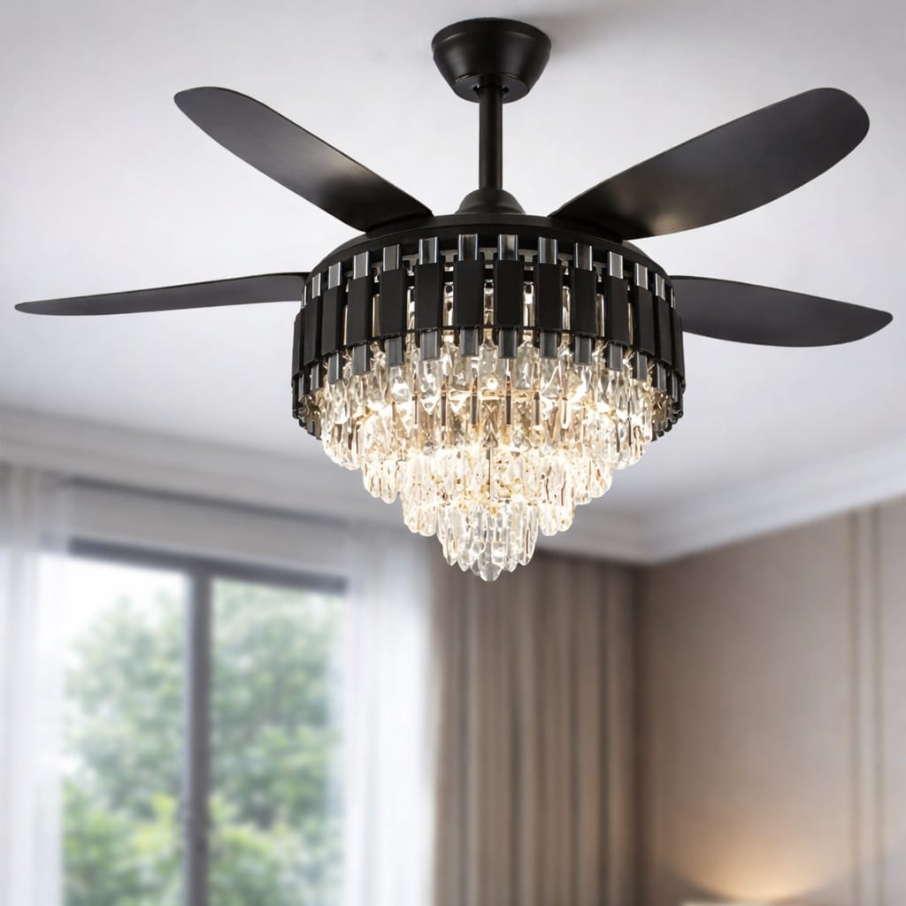 Experience the perfect intersection of industrial strength and high-end glamour. This 1650mm designer ceiling fan is engineered for those who want to make a bold statement without sacrificing performance. Featuring a sleek Black Metal body accented by Glistening Crystals, it transforms a functional appliance into a centerpiece of luxury.