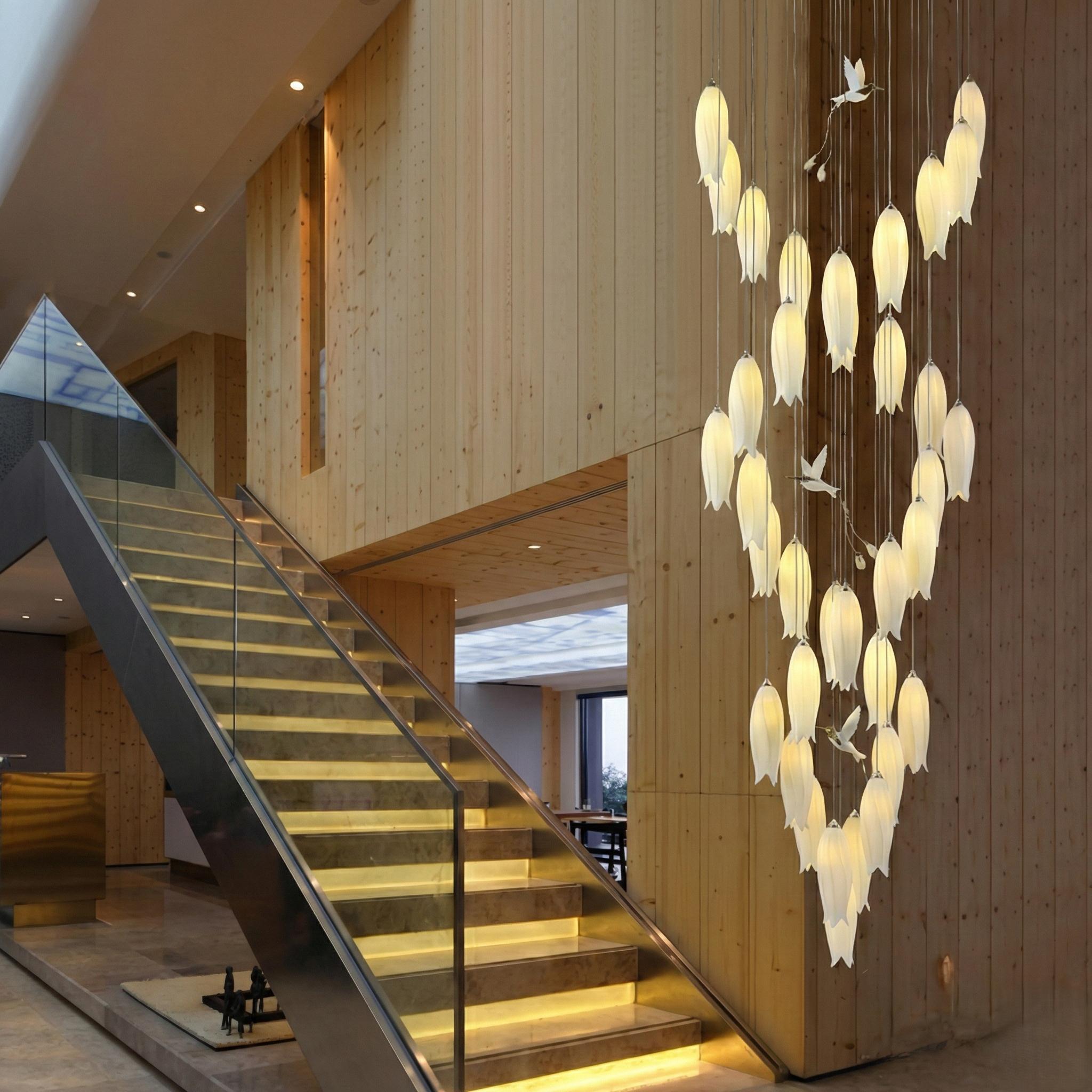 At the heart of its design are 35 delicately sculpted ceramic nests, each one a glowing orb of warm light. These nests are artfully arranged in a cascading formation, creating an ethereal sense of movement and depth. Perched among them are three graceful ceramic birds, adding a touch of life and narrative to the luminous display.