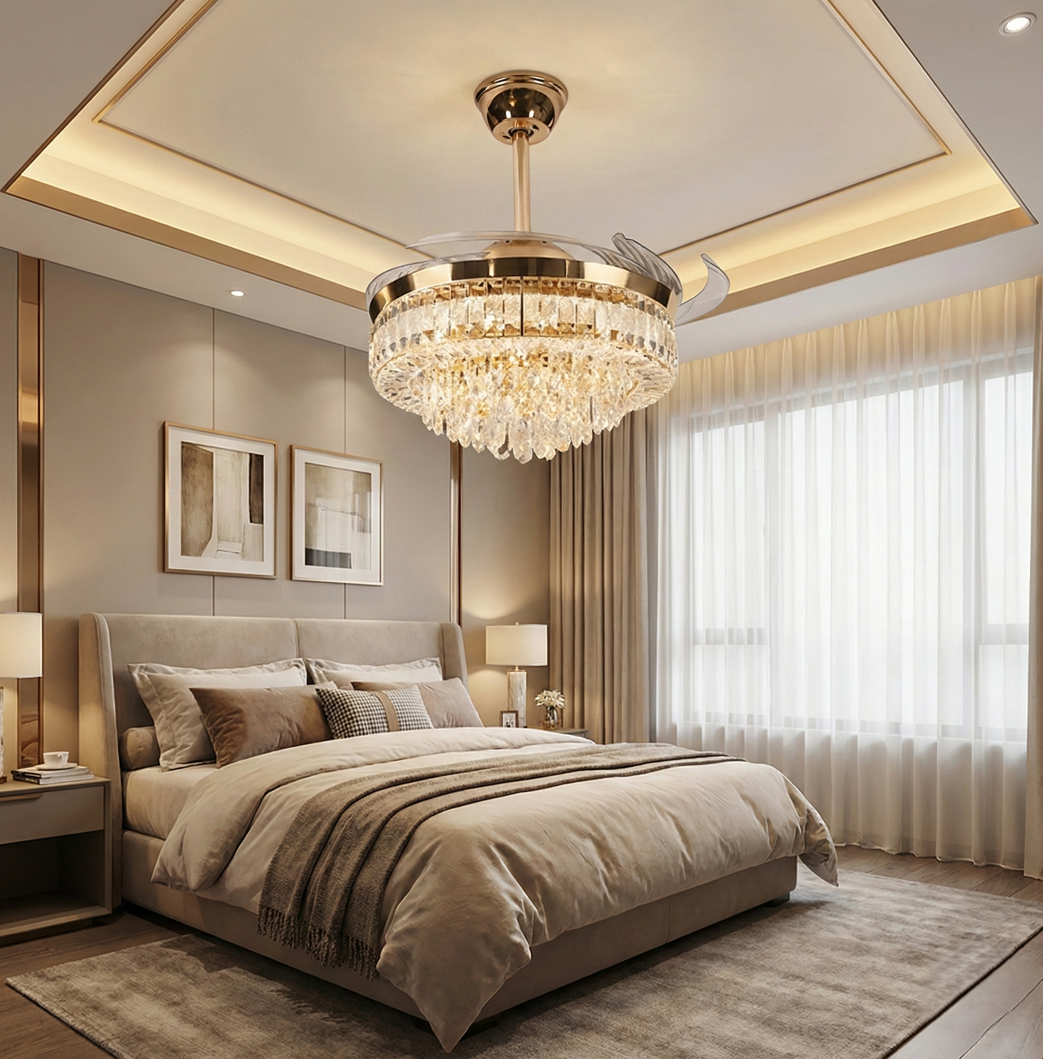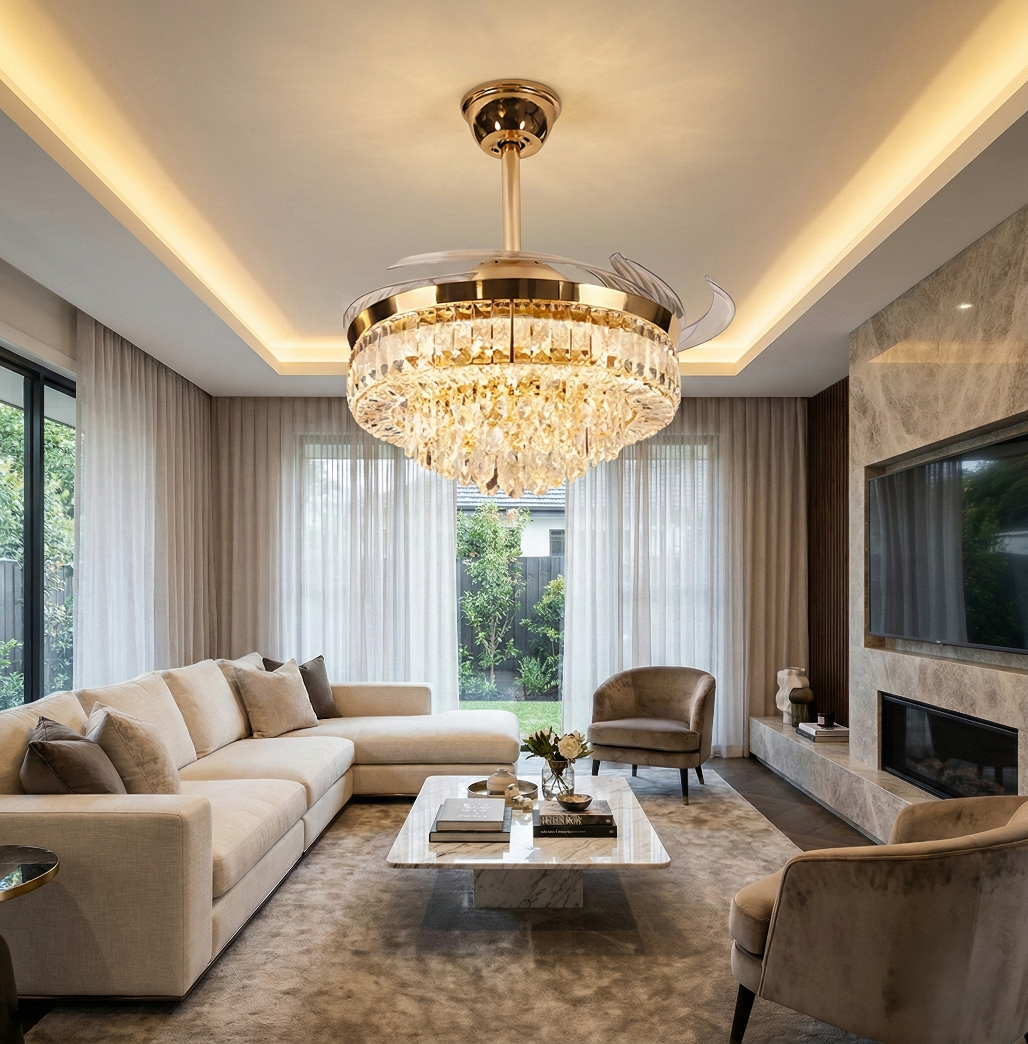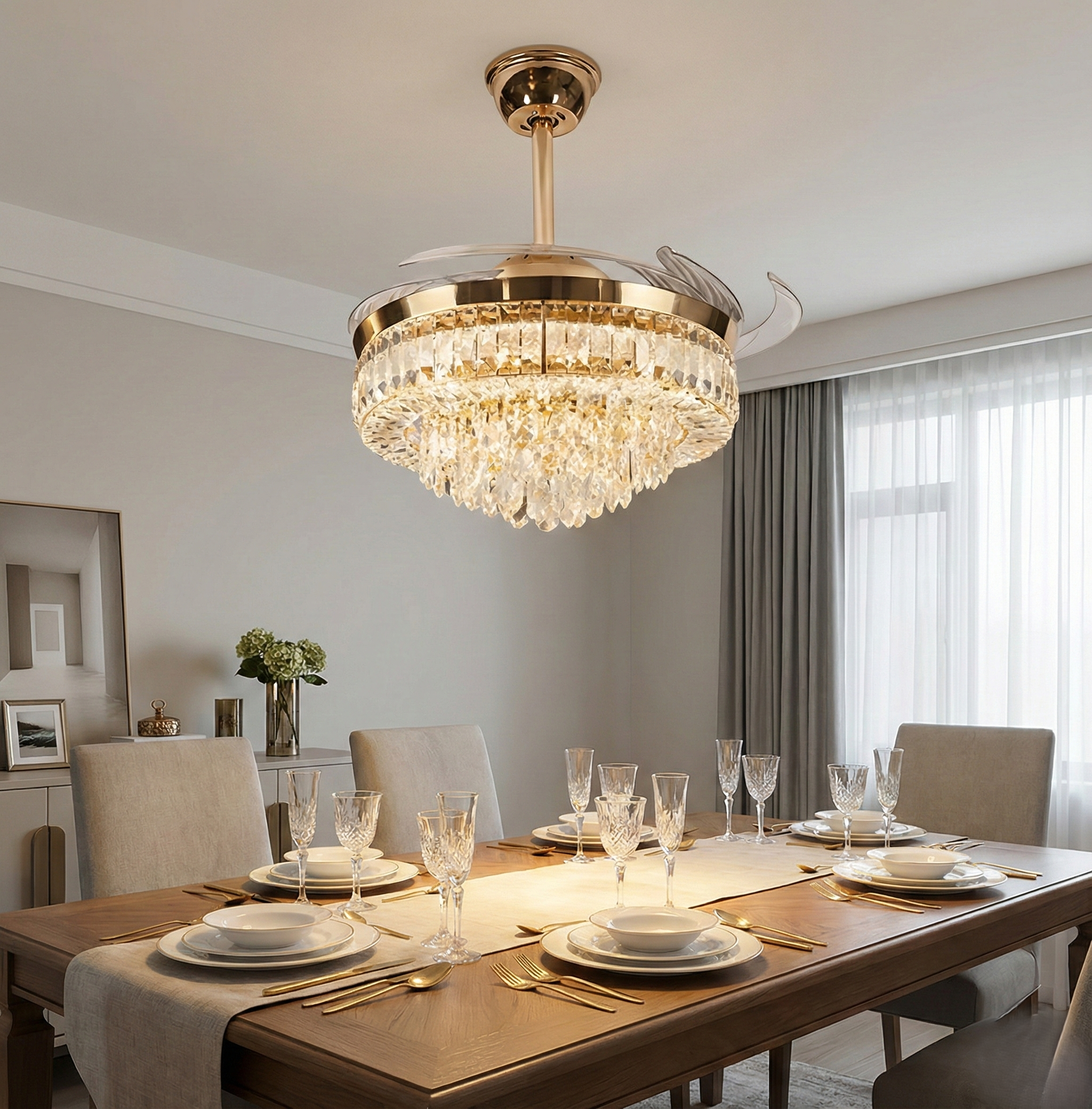Smart Retractable Blades: The four clear acrylic blades (1070mm / 42-inch span) automatically extend when the fan is turned on. When switched off, they retract seamlessly out of sight, leaving behind a stunning chandelier centerpiece.