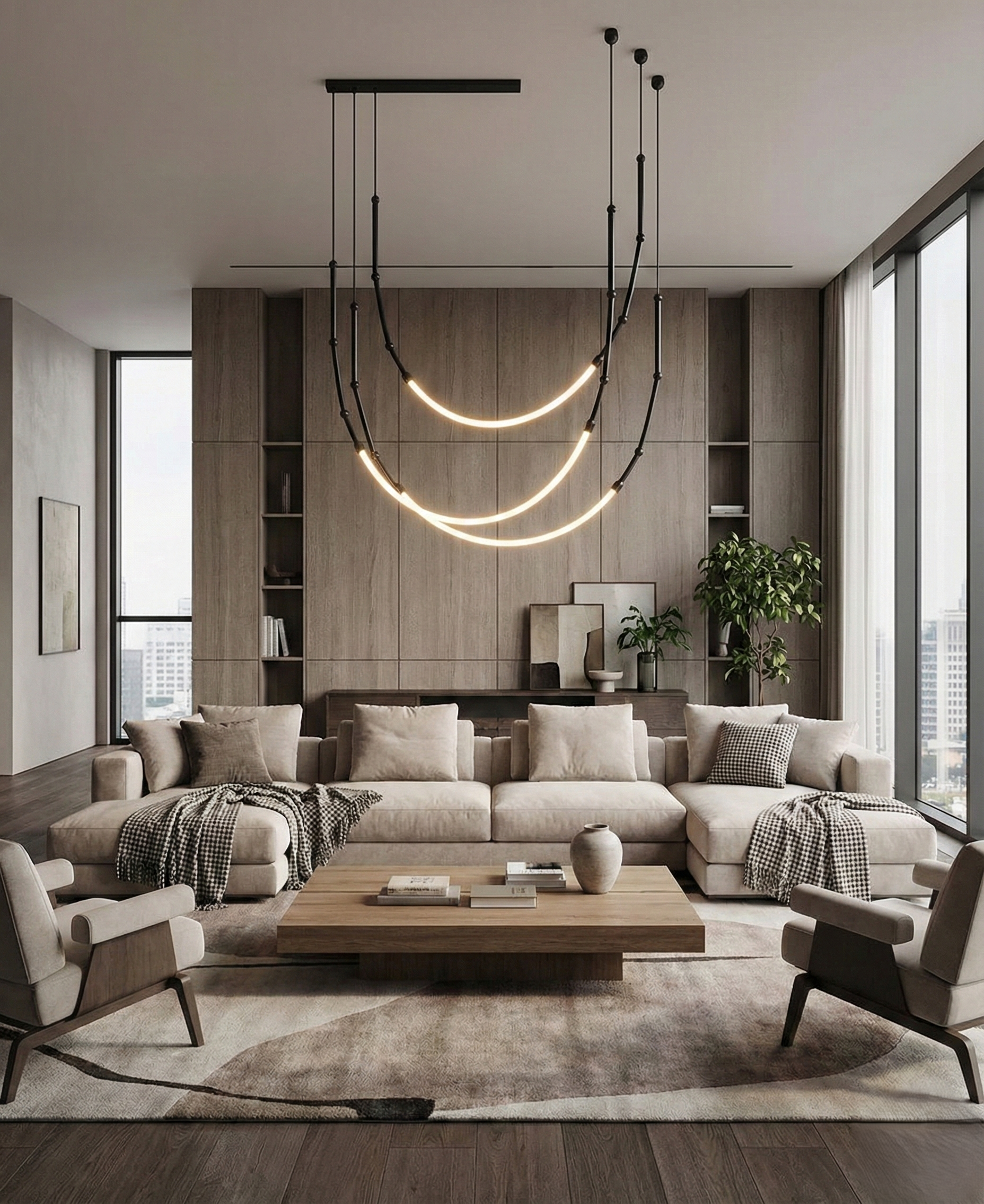 Crafted with a sleek Metal + Profile body type, this chandelier features fluid, arcing ribbons of light suspended by slender black rods. The contrast between the bold black industrial metal hardware and the seamless, glowing LED profiles creates a stunning visual centerpiece, even when switched off. Its minimalist yet dramatic silhouette draws the eye upward, making it an ideal focal point above dining tables, kitchen islands, or in grand living areas.