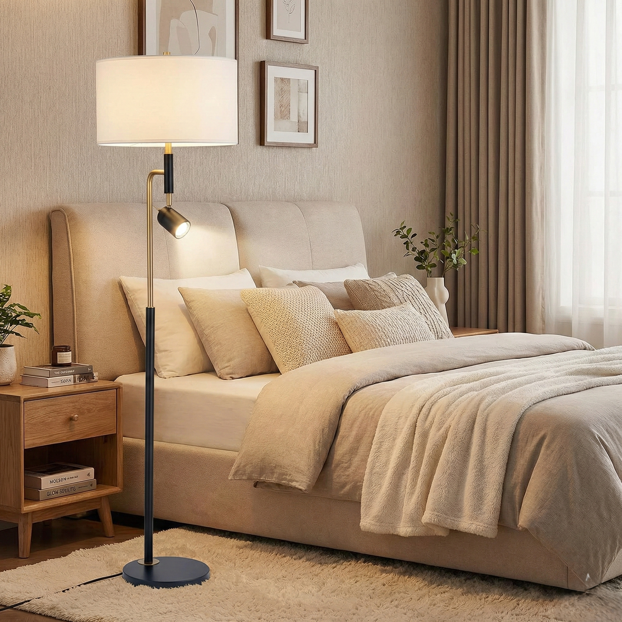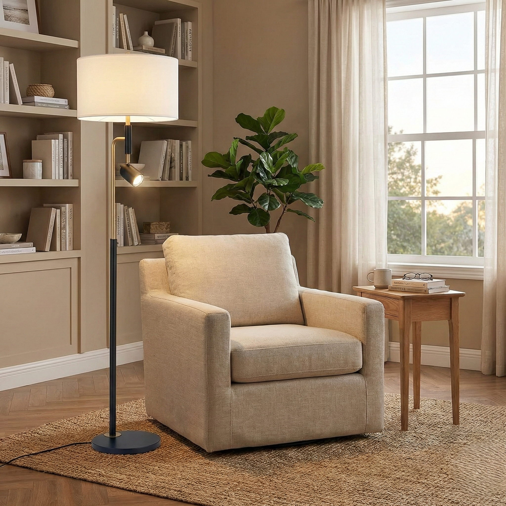 Designed with versatility in mind, it features a dual-lighting system: a main bulb under the spacious 16-inch (40 cm) wide soft white fabric drum shade for warm, ambient room lighting, and an integrated, fully adjustable focus light. Whether you are curling up with a book in your favorite armchair or working late in the study, the Glowworm Floor Lamp provides the exact light you need.