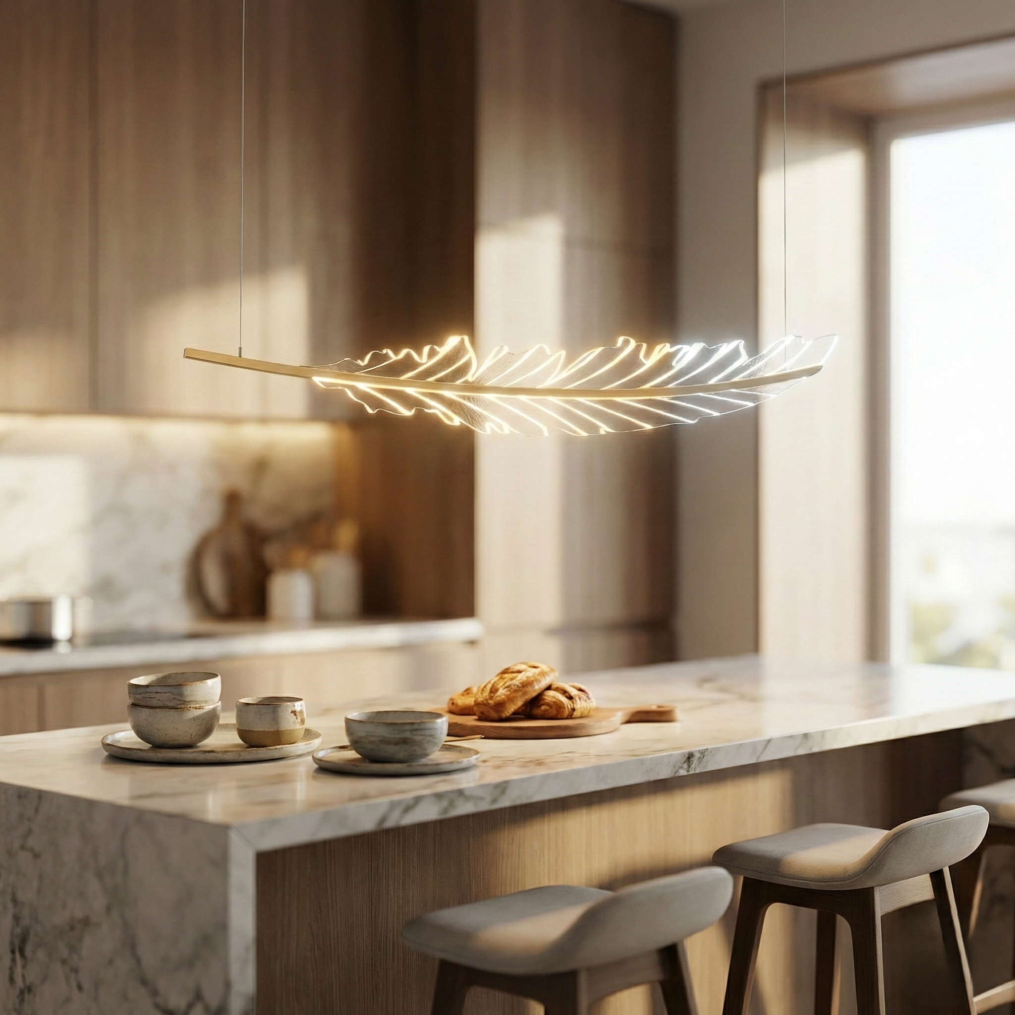 Bring the serene beauty of nature into your home with the Petal Leaf Dining Chandelier. This exquisite linear fixture is designed to look like a floating, luminous leaf or petal, suspended effortlessly in mid-air. Spanning an impressive 1200mm (approx. 4 feet), it creates a captivating focal point perfect for long dining tables, kitchen islands, or executive desks.