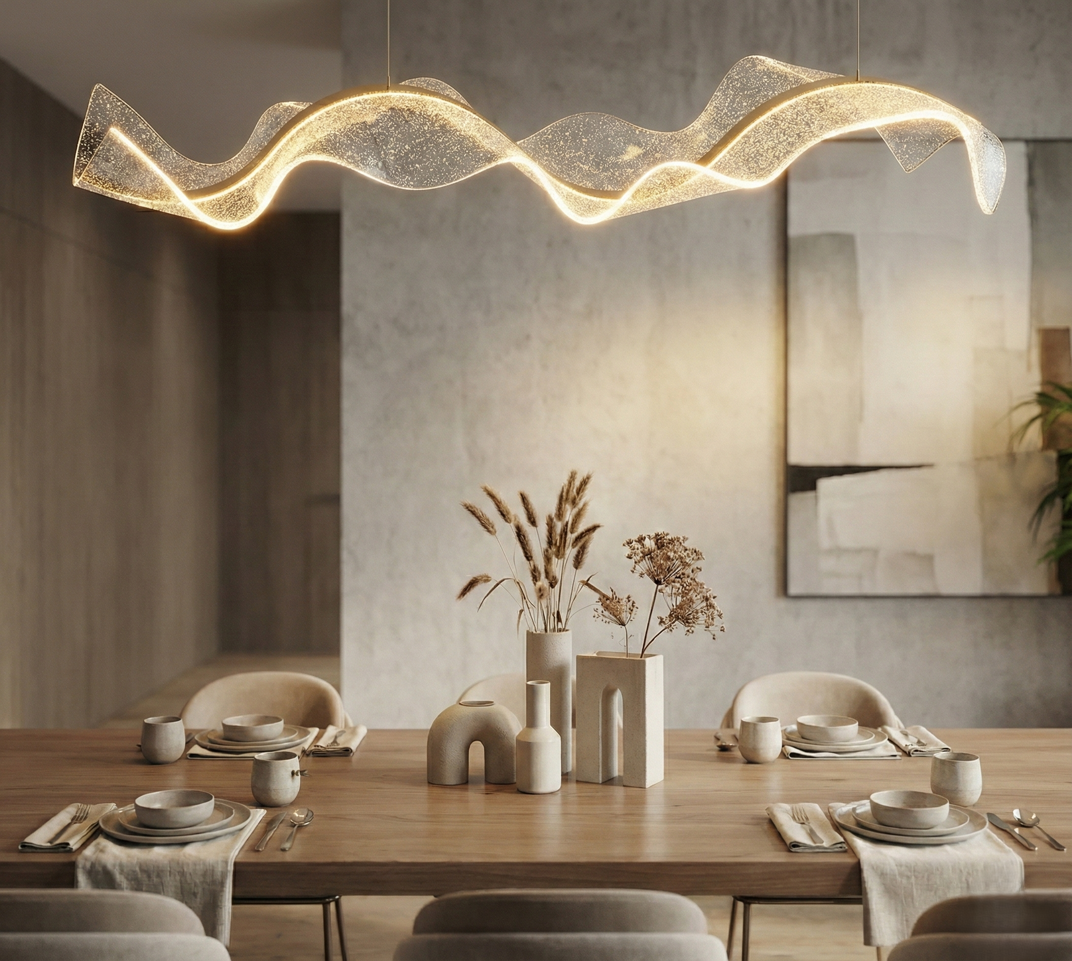Crown your dining experience with the Regal Dining Chandelier, a fixture designed to be the undeniable centerpiece of modern interiors. This sculptural pendant light moves beyond traditional illumination, presenting a fluid, wave-like form that appears to float effortlessly mid-air.
