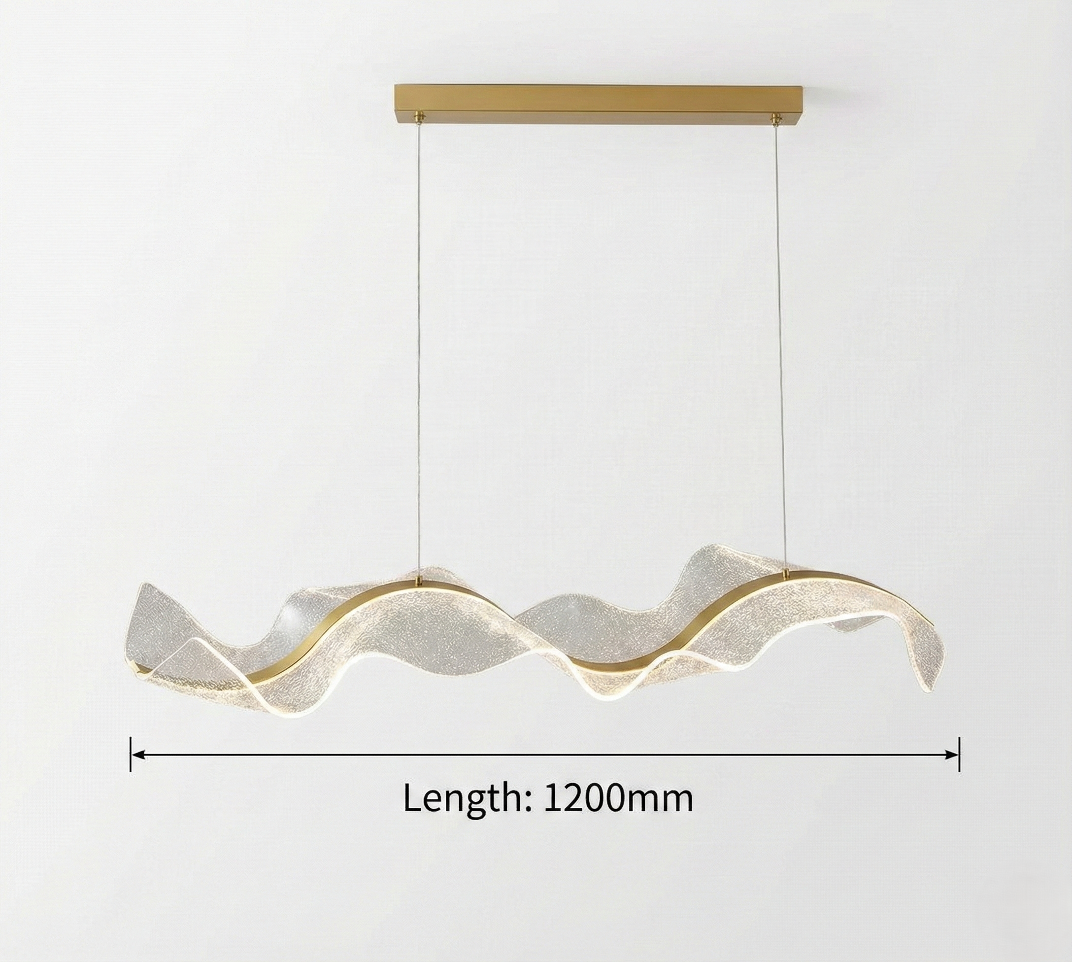 The chandelier’s architecture is built upon a sleek, brushed gold metal spine that contours into graceful undulations. Flanking this central channel are wings of high-quality, textured acrylic. When illuminated, these crystalline diffusers catch and refract the light, creating a shimmering, effervescent glow reminiscent of flowing water or sparkling jewels.