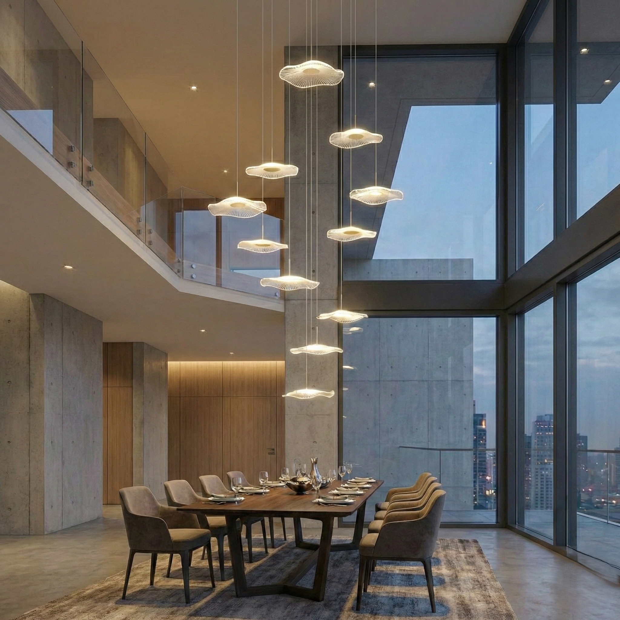 Perfectly sized for staircases, duplex foyers, and high-ceilinged living areas, the chandelier spans a 2-foot diameter and cascades down to an impressive 7-foot height. Each pendant is crafted from high-quality, transparent acrylic with a rippled, organic edge that catches and refracts light beautifully.