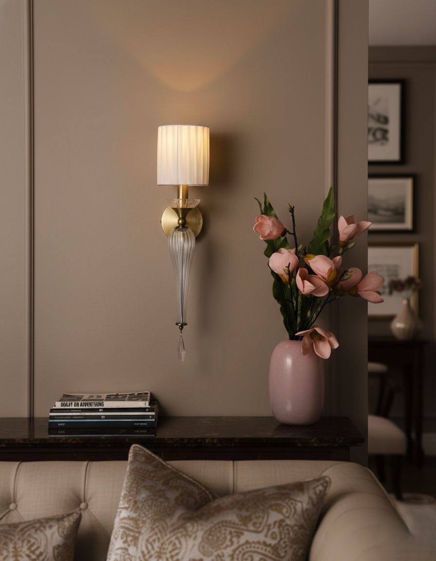 This wall light features a strong metal body structure combined with high-quality crystal accents that beautifully reflect light, creating a warm and luxurious ambiance. The addition of a premium fabric shade ensures soft, glare-free illumination, making it ideal for comfortable everyday lighting.