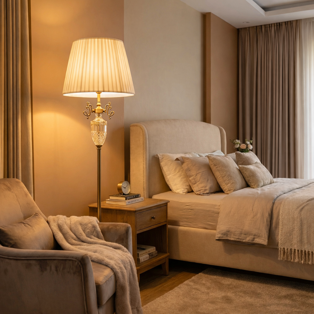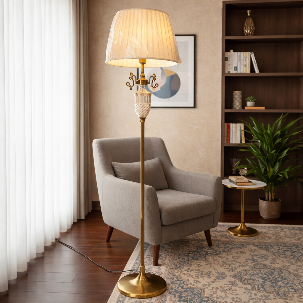 The sturdy metal base features a luxurious brass/gold finish, beautifully complemented by an intricate crystal accent that catches the light. Topped with a classic, finely pleated cloth shade, it perfectly diffuses the light to cast a warm, inviting, amber-toned glow across your bedroom, living room, or study. Whether you are curling up with a book in your favorite armchair or setting a relaxing mood for the evening, this floor lamp delivers unmatched ambiance.