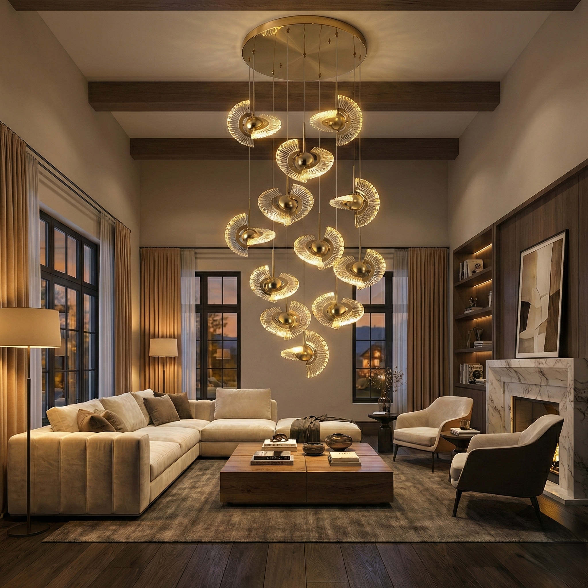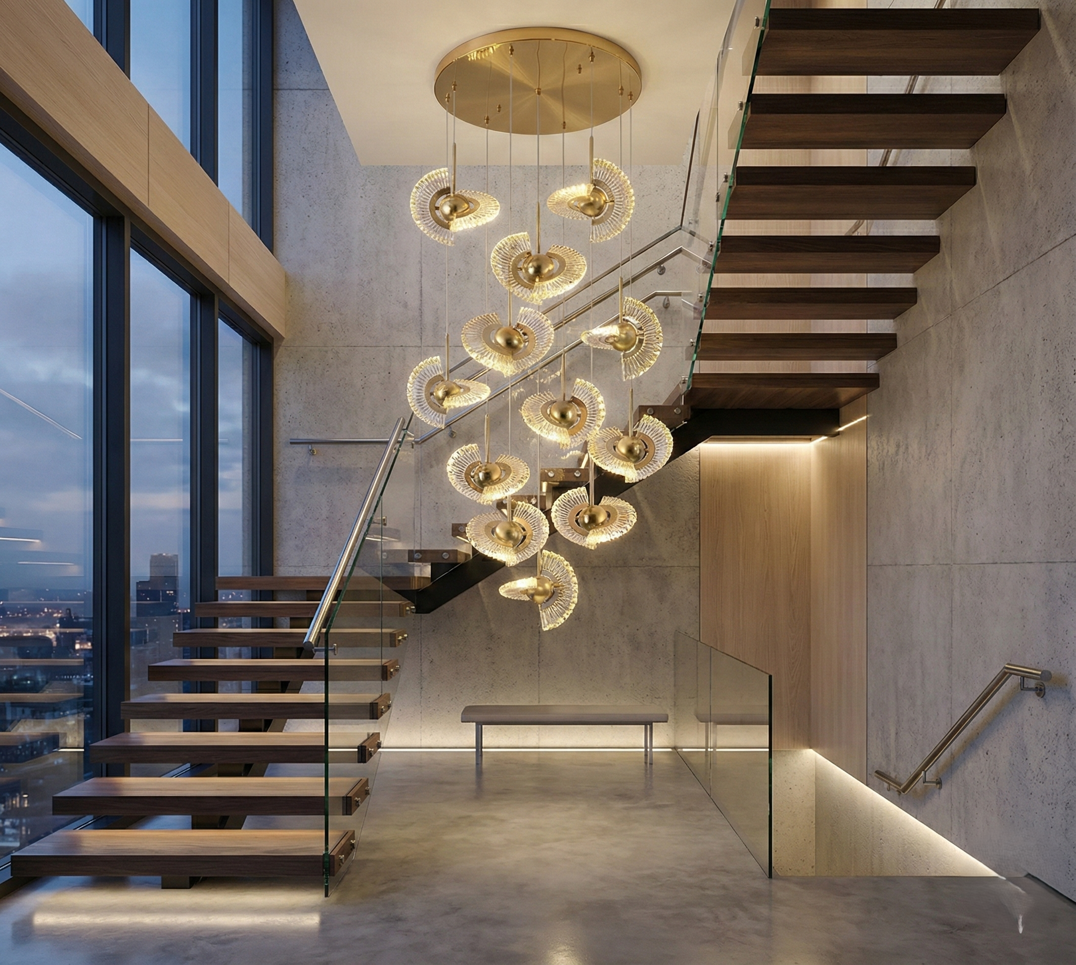 Designed specifically for duplex foyers, grand staircases, and soaring living areas, the Aura Drop makes a dramatic impression. The 3-foot diameter ceiling canopy provides a substantial base, while the pendants suspend to a total height of 7 feet, perfectly filling large vertical volumes. Integrated warm LED lighting ensures energy efficiency and a long lifespan.