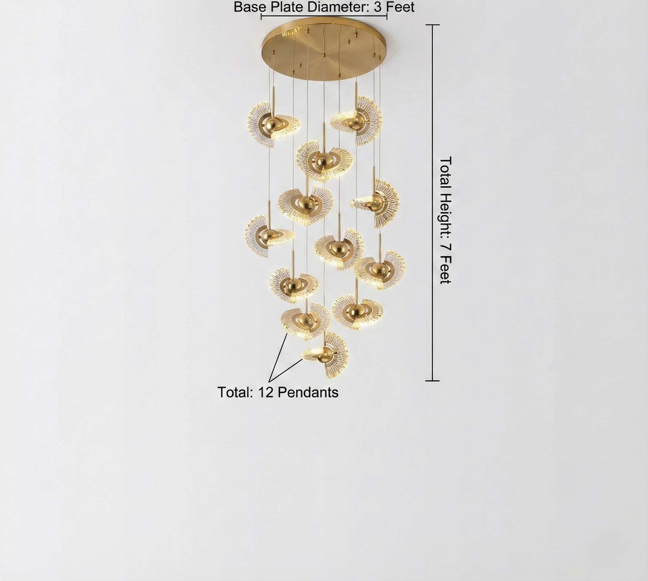 In StockElevate your high-ceilinged space with the breathtaking Aura Drop Pendant Duplex Chandelier, a statement piece inspired by modern luxury. This magnificent fixture features a cascading spiral of 12 individual pendants, each crafted with a brushed gold finish and a unique, fan-shaped crystal shade that refracts light into a warm, sparkling glow.