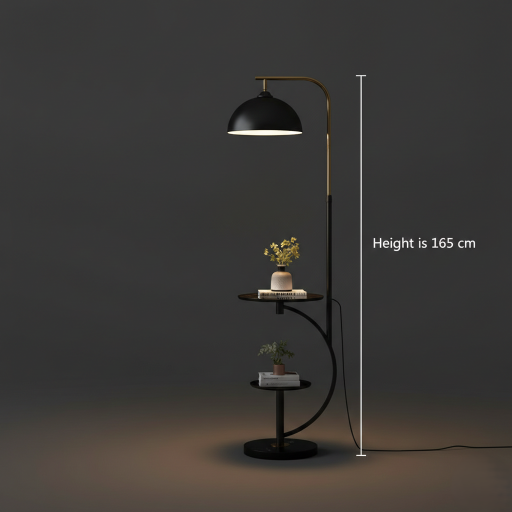 The lamp features a sleek matte black frame accented with luxurious gold hardware. Its integrated dual trays are perfect for holding your morning coffee, a favorite book, or a decorative plant, while the overhead dome shade directs a focused glow ideal for reading or lounging. Anchored by a sturdy base, The Fusion is the perfect companion for your favorite armchair or bedside.