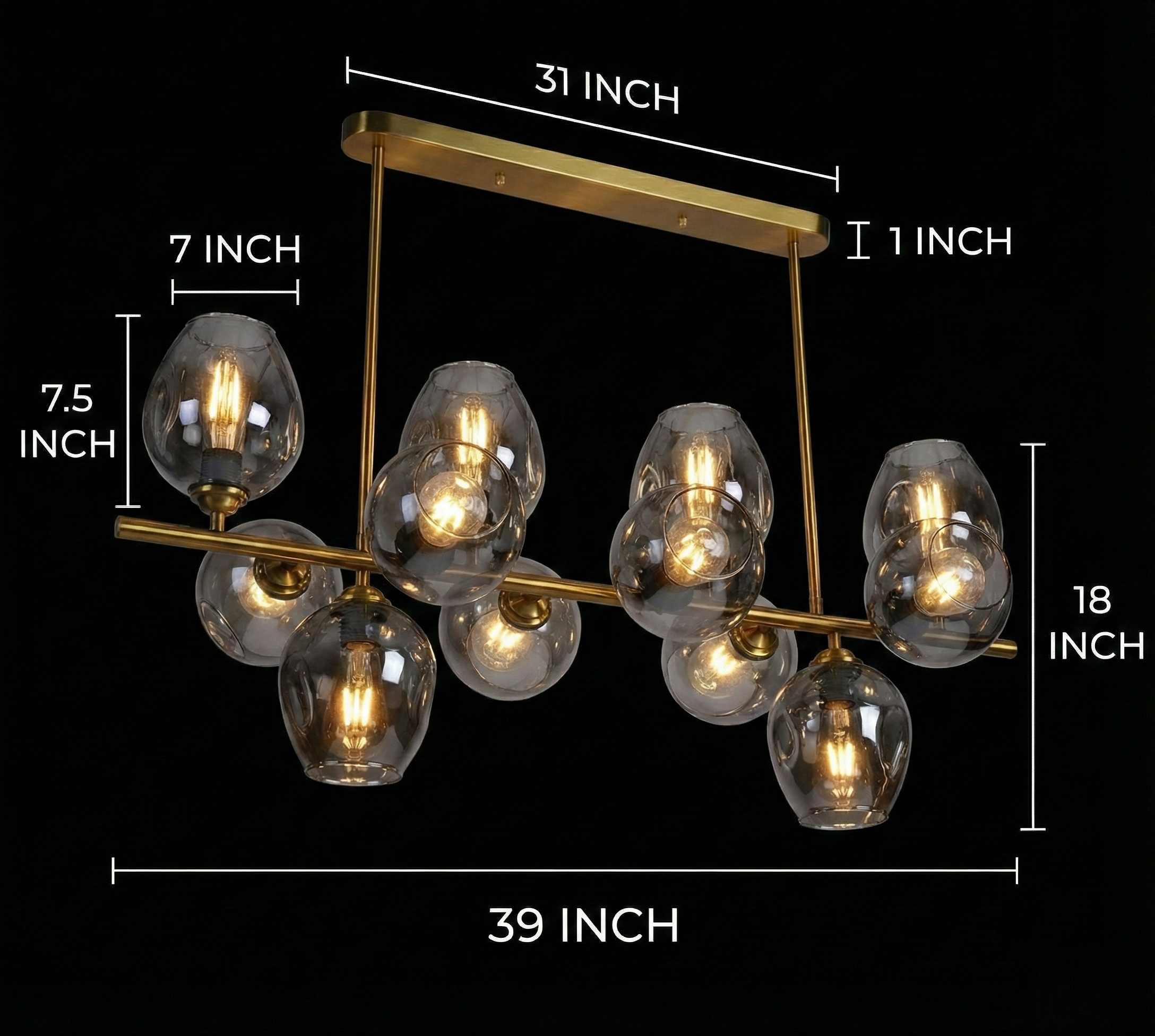 With a total length of 39 inches and a fixture body height of 18 inches, this chandelier offers substantial presence without overwhelming a space. Each individual glass shade measures 7 inches in width and 7.5 inches in height, creating a balanced, rhythmic look across the fixture. The entire piece is suspended from a rectangular ceiling plate that is 31 inches long and 1 inch high.