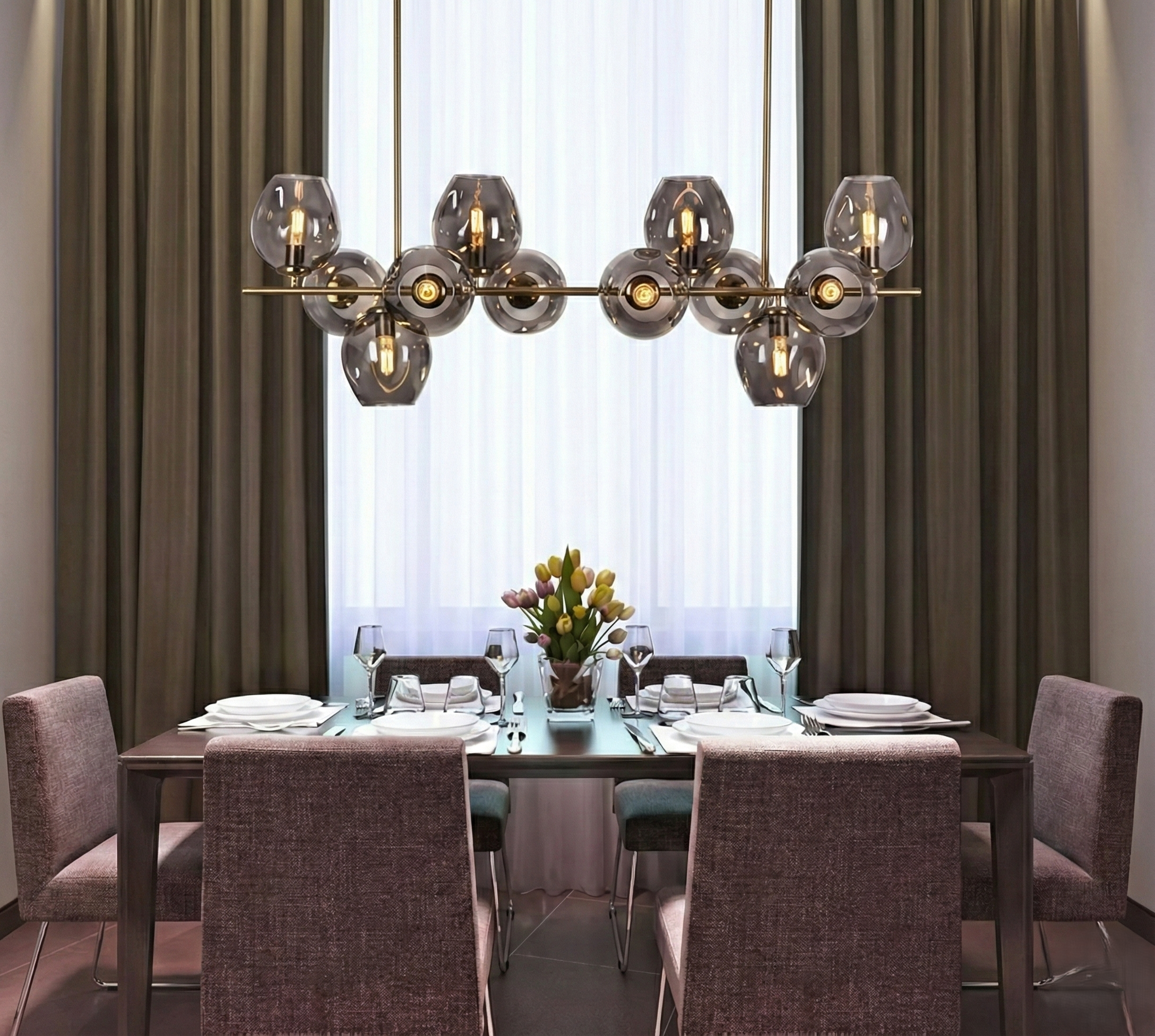 What sets The Orbit apart are its eight organically shaped glass shades, resembling natural pebbles or bubbles, which add a unique sculptural element to the design. As depicted in the provided views, these shades come in variations of warm amber or sleek smoke grey, both designed to diffuse light beautifully from exposed filament bulbs.