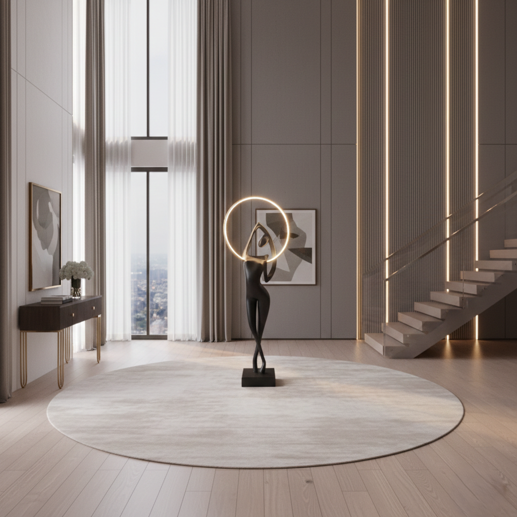 Step into the realm of modern mysticism with The Void Circle Artifact, a sculptural masterpiece that explores the balance between light and nothingness. Standing at an impressive 1800mm, this floor lamp features a matte black resin figure that seems to disappear into the shadows, only to be framed by a brilliant, suspended ring of LED light.