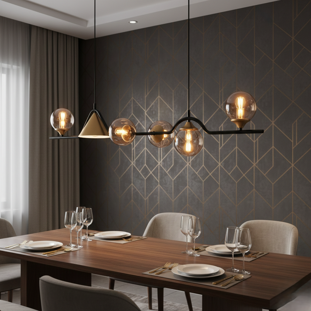 The sturdy metal body ensures long-lasting performance and stability, while the finely finished glass components help diffuse light evenly, reducing glare and creating a comfortable atmosphere. Its versatile design complements a wide range of interior styles — from contemporary and minimalist to classic and luxurious — making it a perfect addition to dining rooms, kitchen areas, or stylish living spaces.