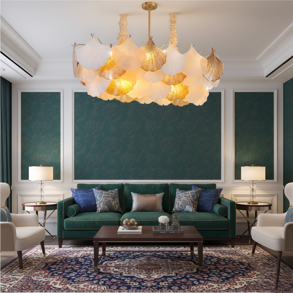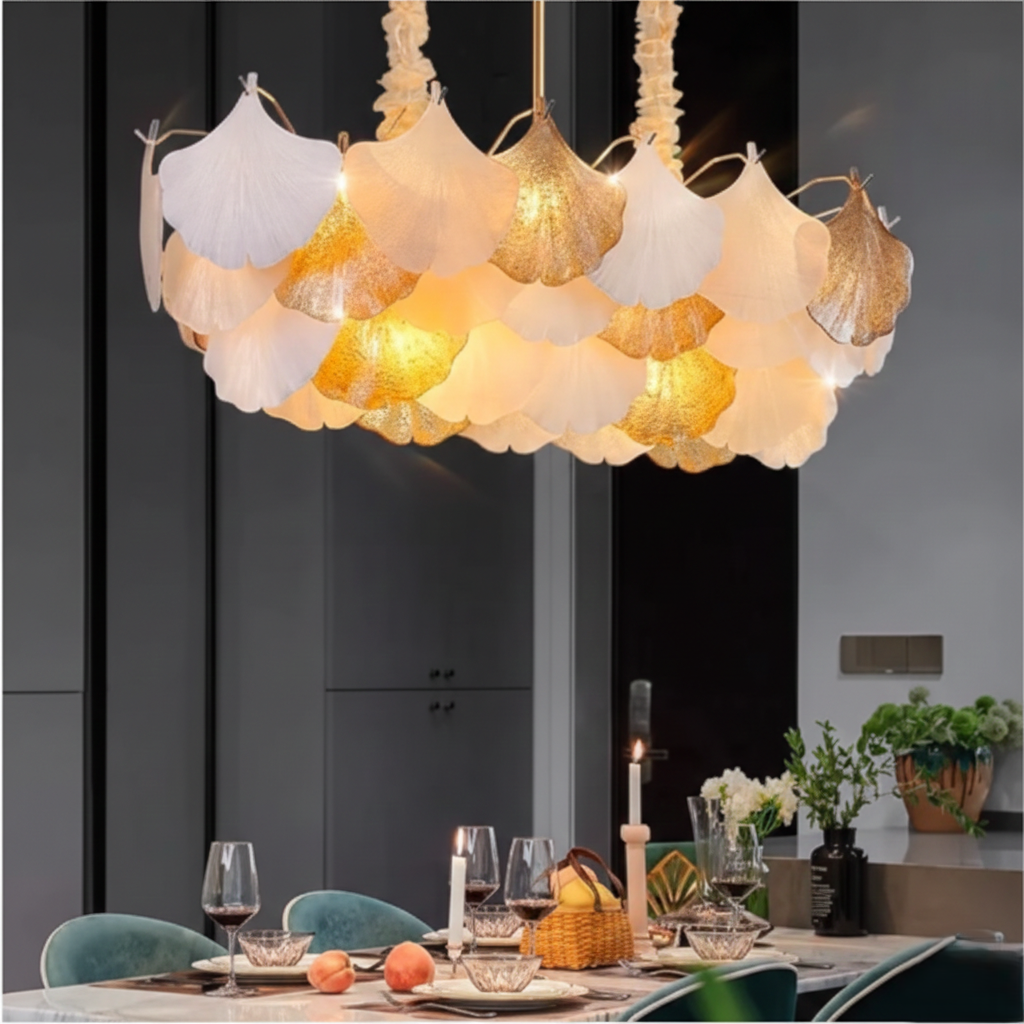 In StockEnhance your dining space with this beautifully crafted chandelier, designed to combine modern sophistication with timeless charm. Featuring a sleek metal frame paired with premium glass elements, this chandelier creates a warm and inviting ambiance—perfect for family dinners, gatherings, or special occasions.
